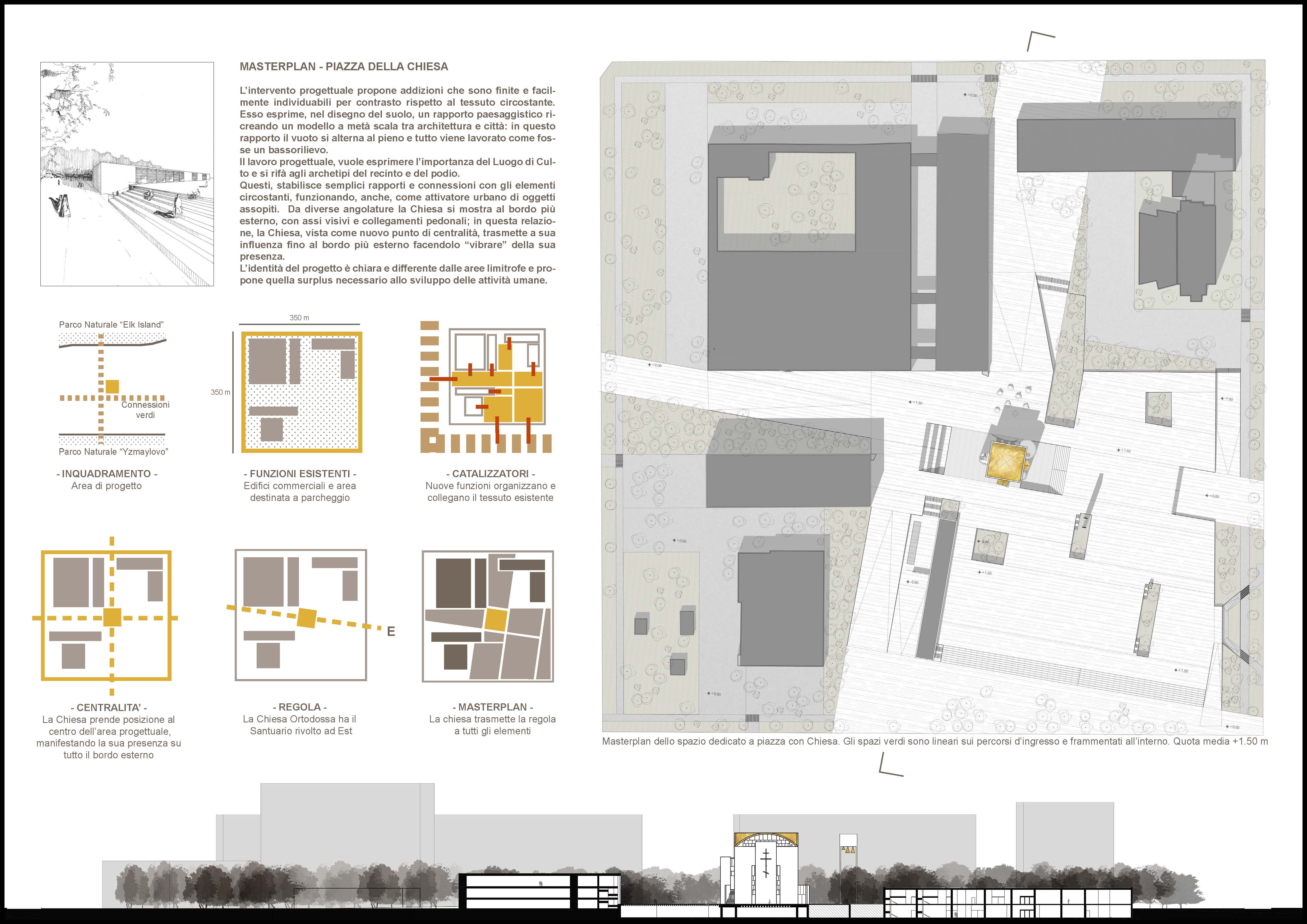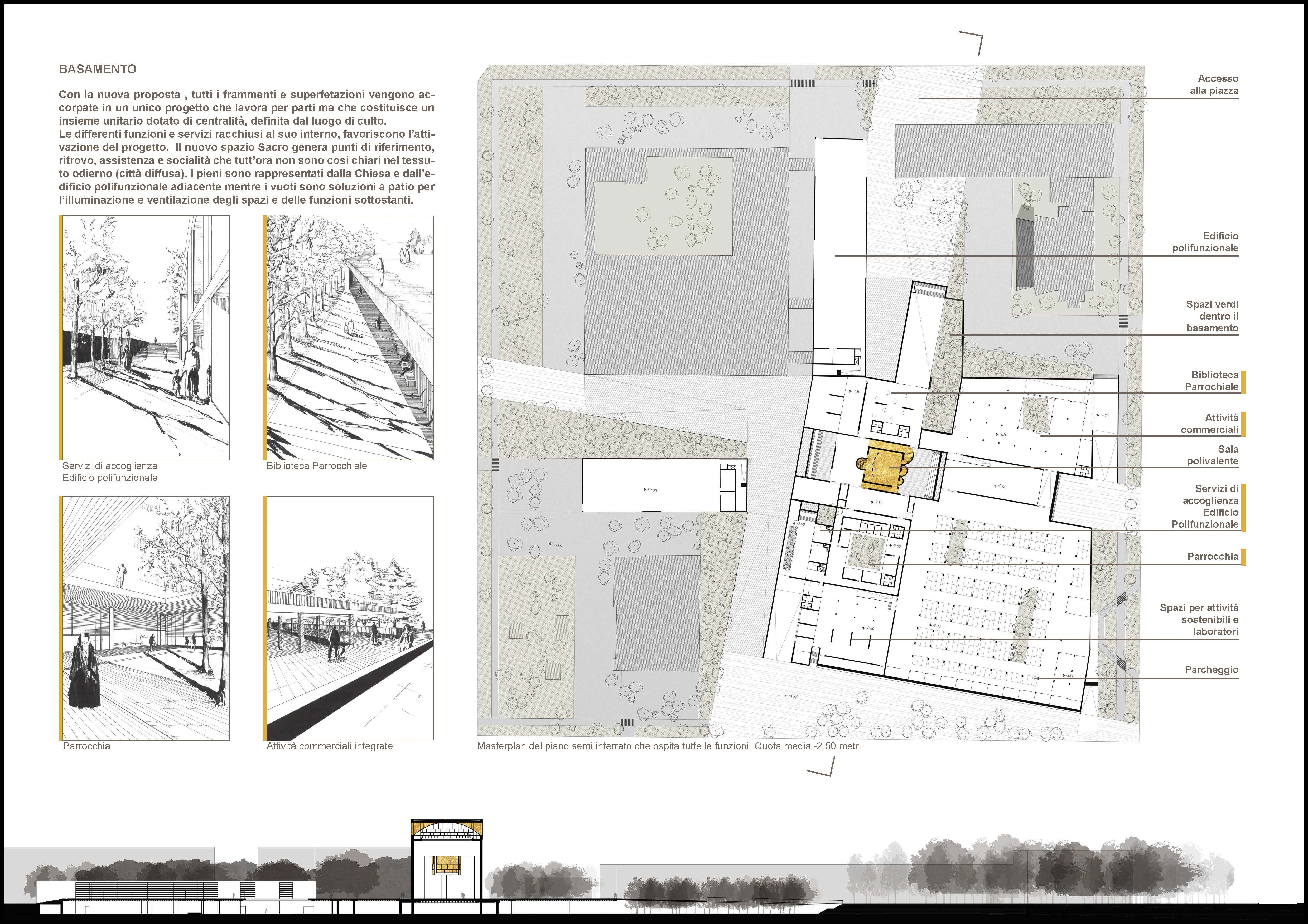 Il progetto viene realizzato all’interno di un lotto residenziale destinato a parcheggio e con servizi differenti su tutto il confine: il primo step è caratterizzato dalla progettazione di un basamento alto 1,50 metri, per racchiudere e organizzare molte delle funzioni commerciali presenti, fornire lo spazio di costruzione per la parrocchia e dotare la chiesa, che viene costruita al livello superiore, di uno spazio sacro diverso dal suolo circostante. Il basamento occupa solo il 25% dell’intera quadra ma la presenza della chiesa è centrale all’area: questa trasmette la sua presenza fin sul bordo più esterno, mediante collegamenti ciclo-pedonali che generano continuità visiva e di fruizione con l’interno. Il progetto del verde stimola questi collegamenti e, all’interno, genera spazi utili per la ventilazione o l’illuminazione degli ambienti sottostanti, legando natura e urbanità.