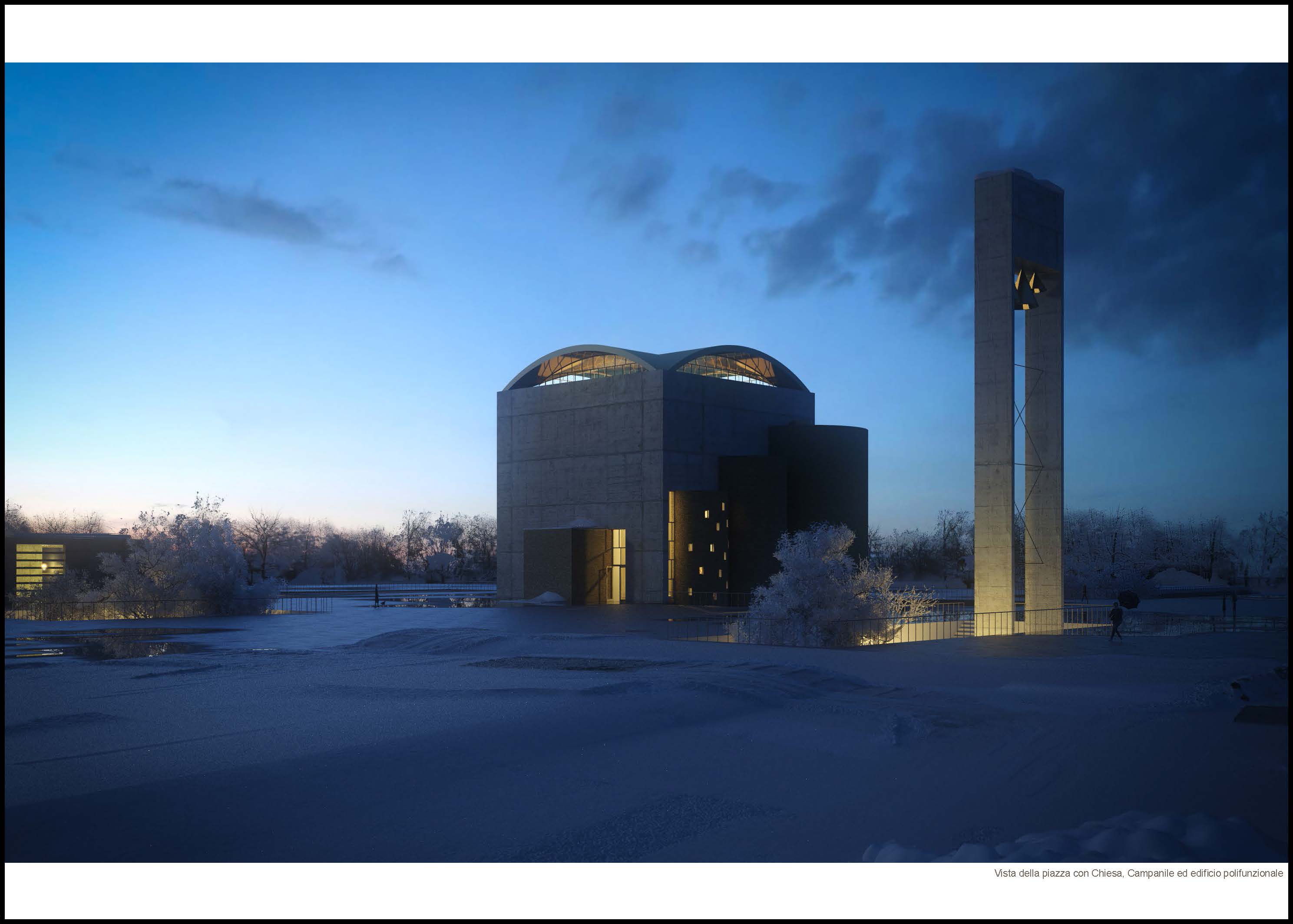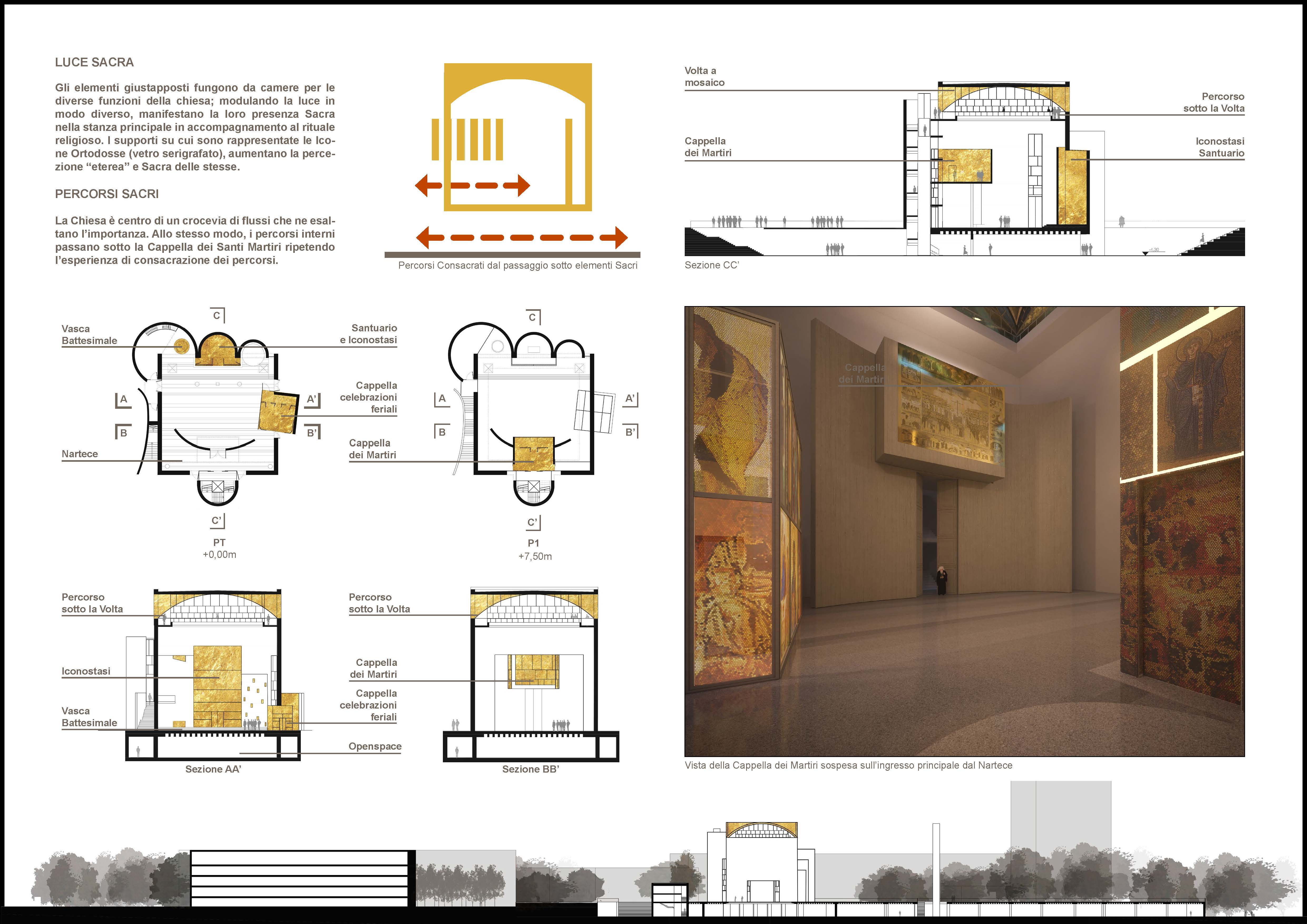Questa nuova idea di sacralità mira a costituire, da tutti i frammenti urbani e preesistenze, uno spazio unitario che lavora per parti, ponendo il luogo di culto al centro di una nuova riqualificazione, migliorando l’esperienza urbana e consolidando l’identità del luogo.